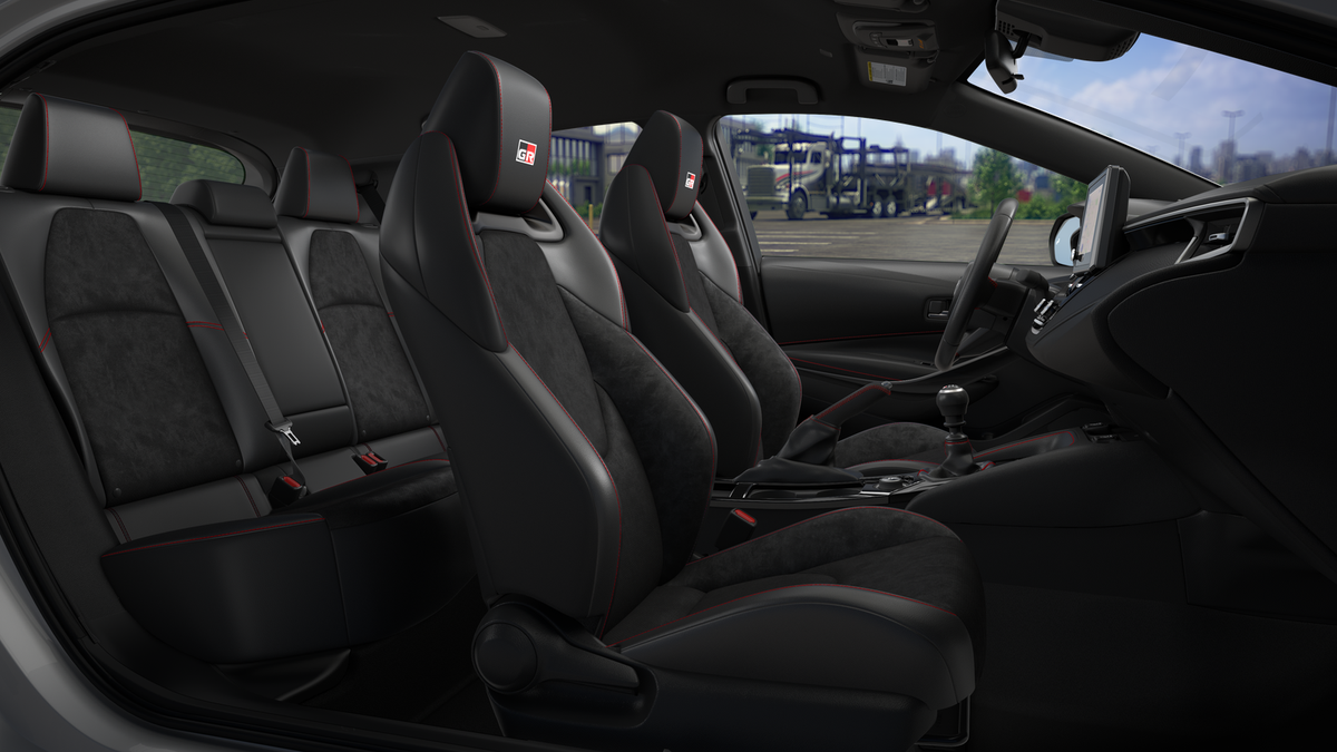 Introducing the 2026 Toyota GR Corolla Premium Plus, a perfect fusion of performance and sophistication. This dynamic hatchback boasts a sleek black exterior that exudes an athletic presence, accentuated by its meticulously crafted black Brin Naub(r) and synthetic leather-trimmed interior featuring striking red stitching. Under the hood, the GR Corolla is powered by a robust 1.6L 3-cylinder engine that delivers an exhilarating driving experience, perfectly matched with a manual transmission for those who appreciate a hands-on approach. The combination of compact dimensions and powerful engineering allows for agile handling and responsiveness, making it an ideal choice for both city driving and spirited journeys. Inside, the Premium Plus trim surrounds you with premium materials and modern technology, providing comfort and convenience with every ride. Enjoy the latest features designed to enhance both driving pleasure and passenger experience. Whether you're navigating through urban streets or taking on winding roads, the 2026 Toyota GR Corolla Premium Plus is designed to leave a lasting impression. Elevate your driving experience with this remarkable vehicle-where performance meets luxury in every detail.