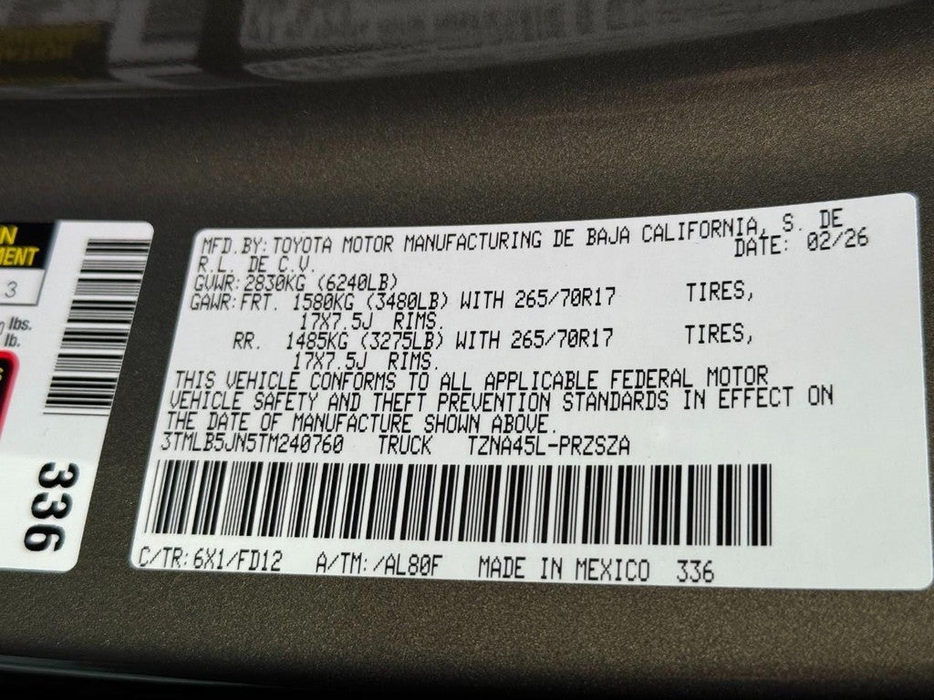 Introducing the 2026 Toyota Tacoma 4WD TRD Off Road Double Cab, a rugged yet refined truck designed to conquer both urban and off-road environments with confidence. Finished in a striking bronze oxide exterior, this Tacoma is sure to turn heads while commanding respect on any terrain. Under the hood, you'll find a 2.4L 4-cylinder engine that combines efficiency and power, ensuring you can tackle challenging trails or handle daily driving with ease. The roomy double cab design accommodates up to five passengers, providing ample space for both passengers and cargo alike. The 5' bed offers versatile storage options for all your gear, making it an ideal companion for adventure seekers. The boulder black interior exudes sophistication and durability, featuring high-quality materials and advanced technology for a comfortable ride. With its TRD Off Road package, this Tacoma is equipped with enhanced features specifically designed for off-road enthusiasts, ensuring peak performance on rough terrain. Elevate your driving experience with the 2026 Toyota Tacoma-where reliability meets adventure. Don't miss your chance to own this exceptional truck!