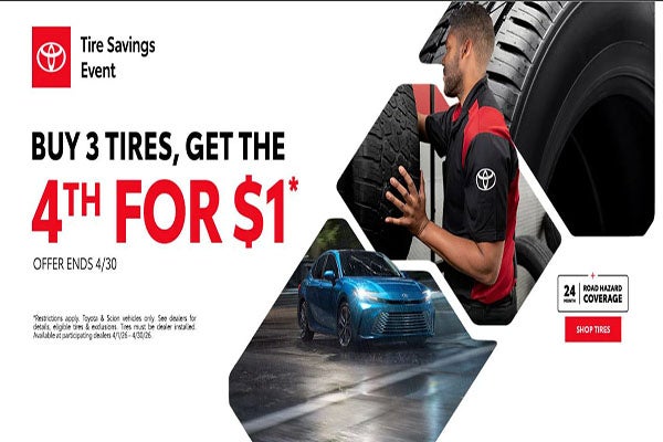 Restrictions apply. Toyota & Scion vehicles only. See dealer for details, eligible tires & exclusions. Tires must be dealer installed. Available at participating dealers. Expires 4/30/2026